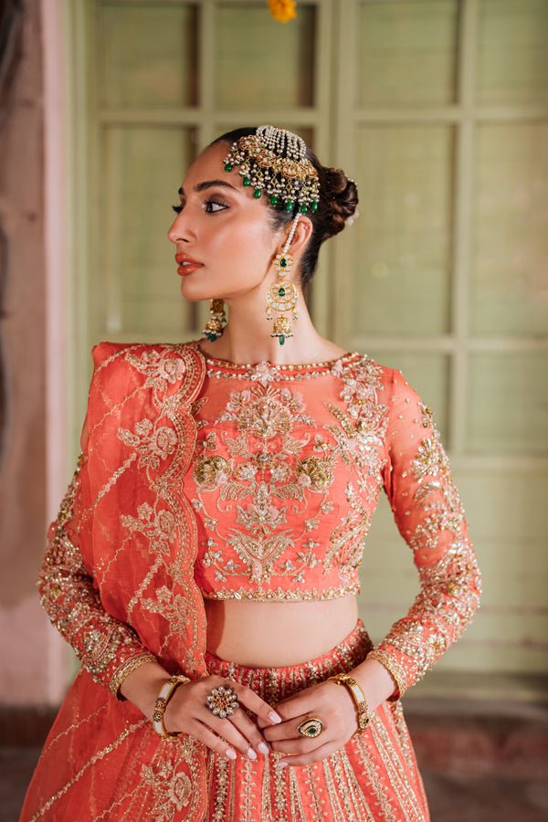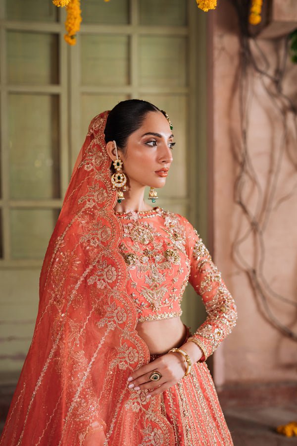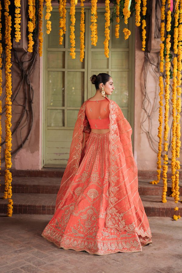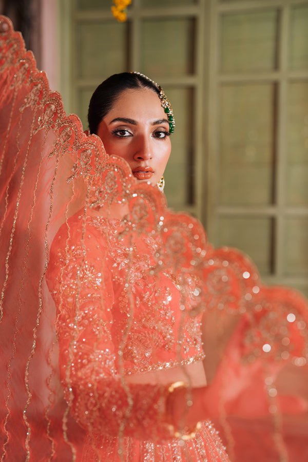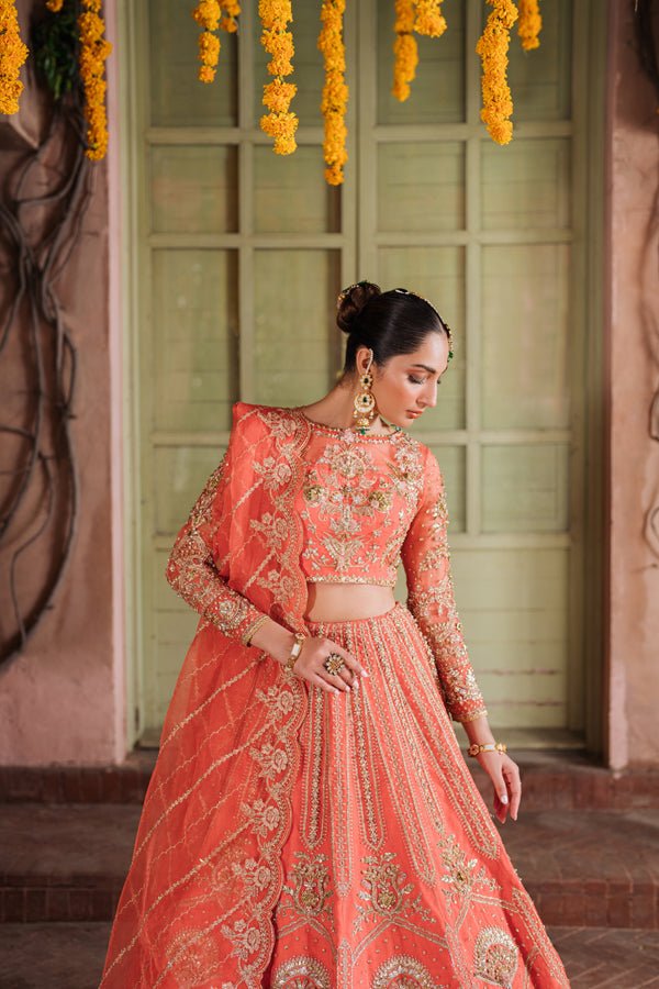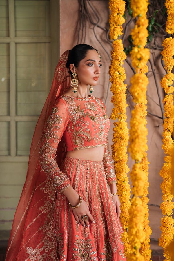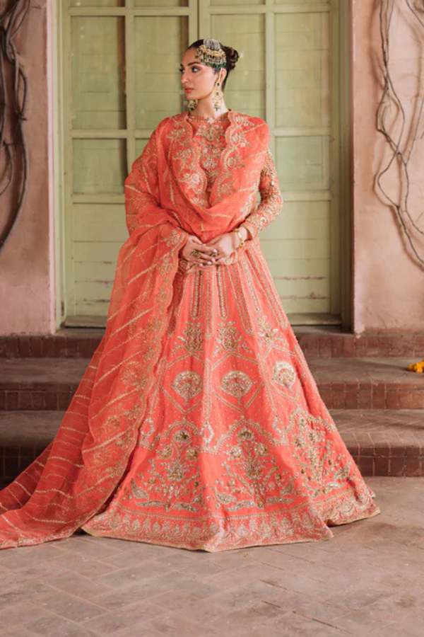 This masterpiece isn’t just an outfit; it’s poetry in motion, capturing the spirit of festive celebrations with every delicate swirl. 🌺 With floral motifs woven into a canvas of coral warmth, Aabirah is designed for the woman who loves tradition but makes it her own.