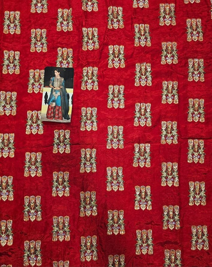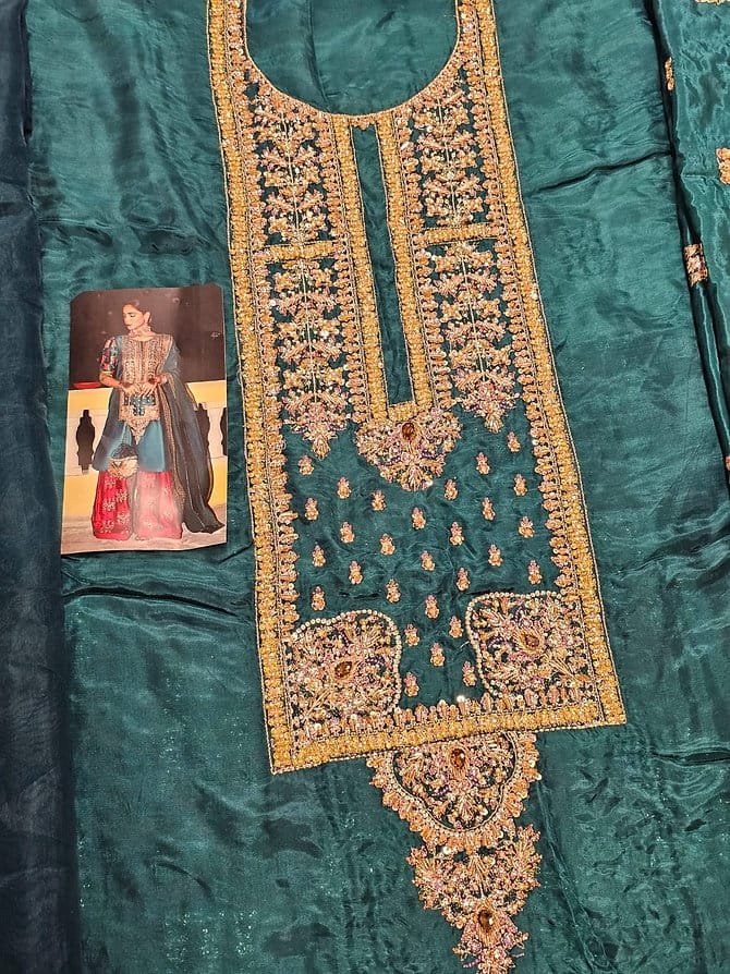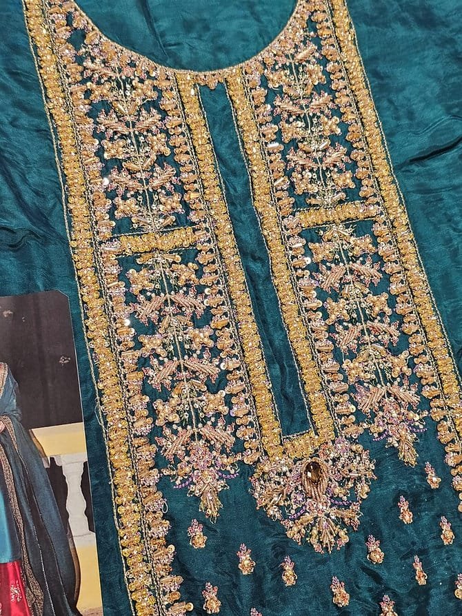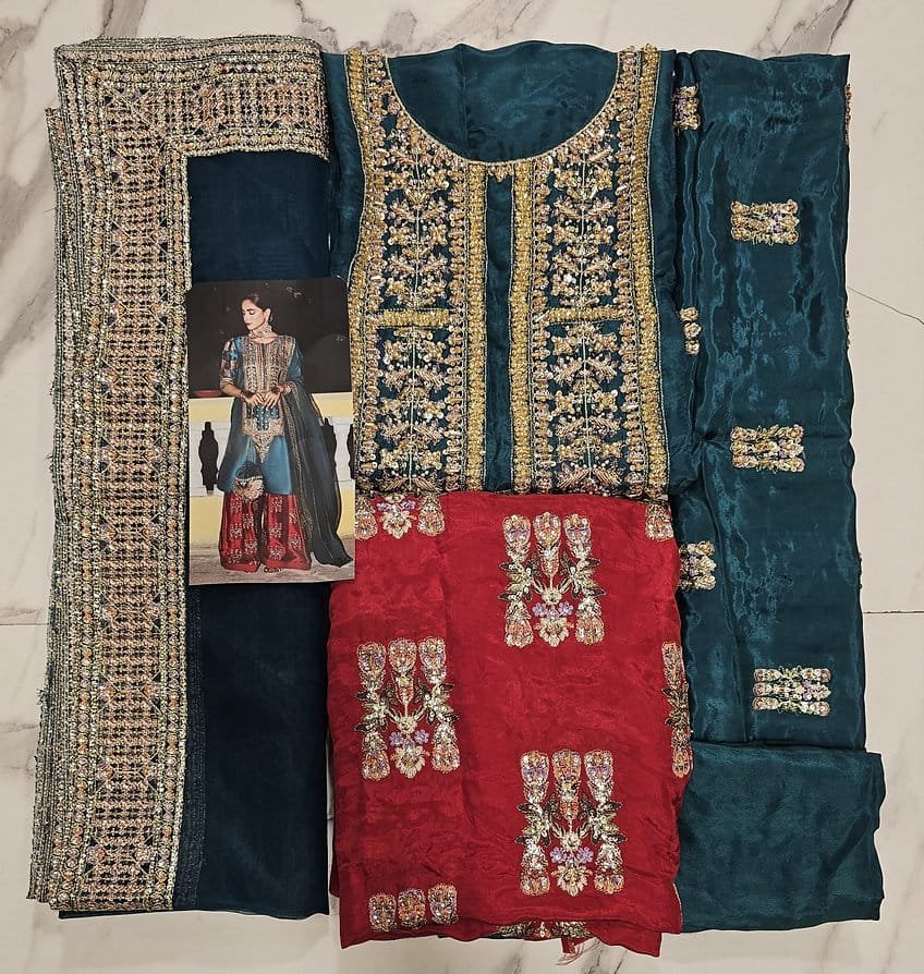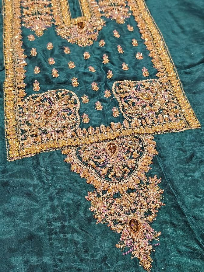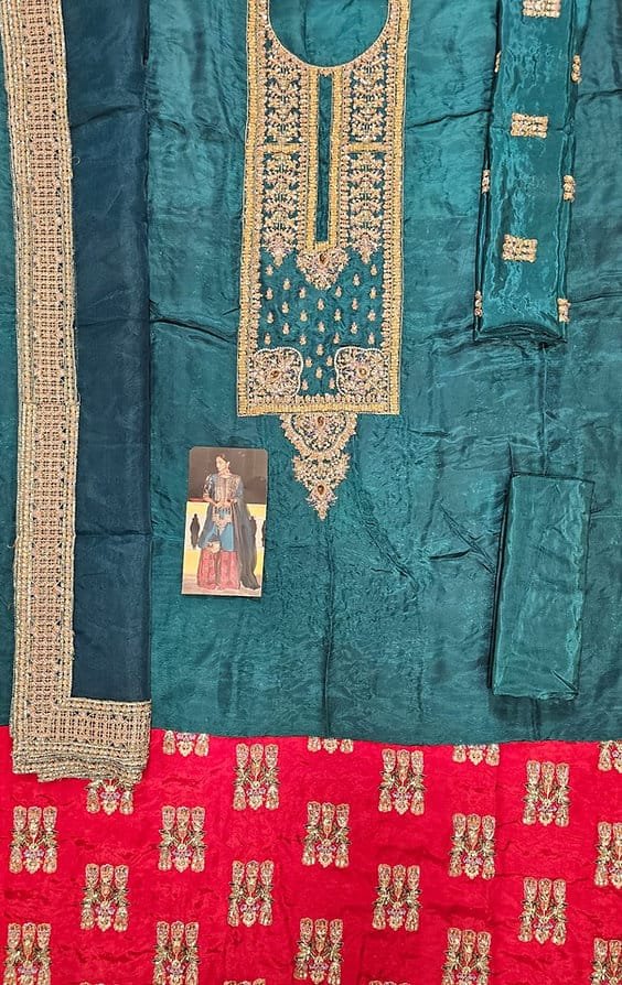 A regal green and red ensemble including a beautiful raw silk shirt embroidered and embellished with pita work detailing on neckline. The neckline is also adorned with gold sequins and naqshi with gold and pink buggle beads and colorful block printed puff sleeves. It is paired with heavily embroidered and embellished red shalwar. It is paired with green organza dupatta with block printed four sided border.