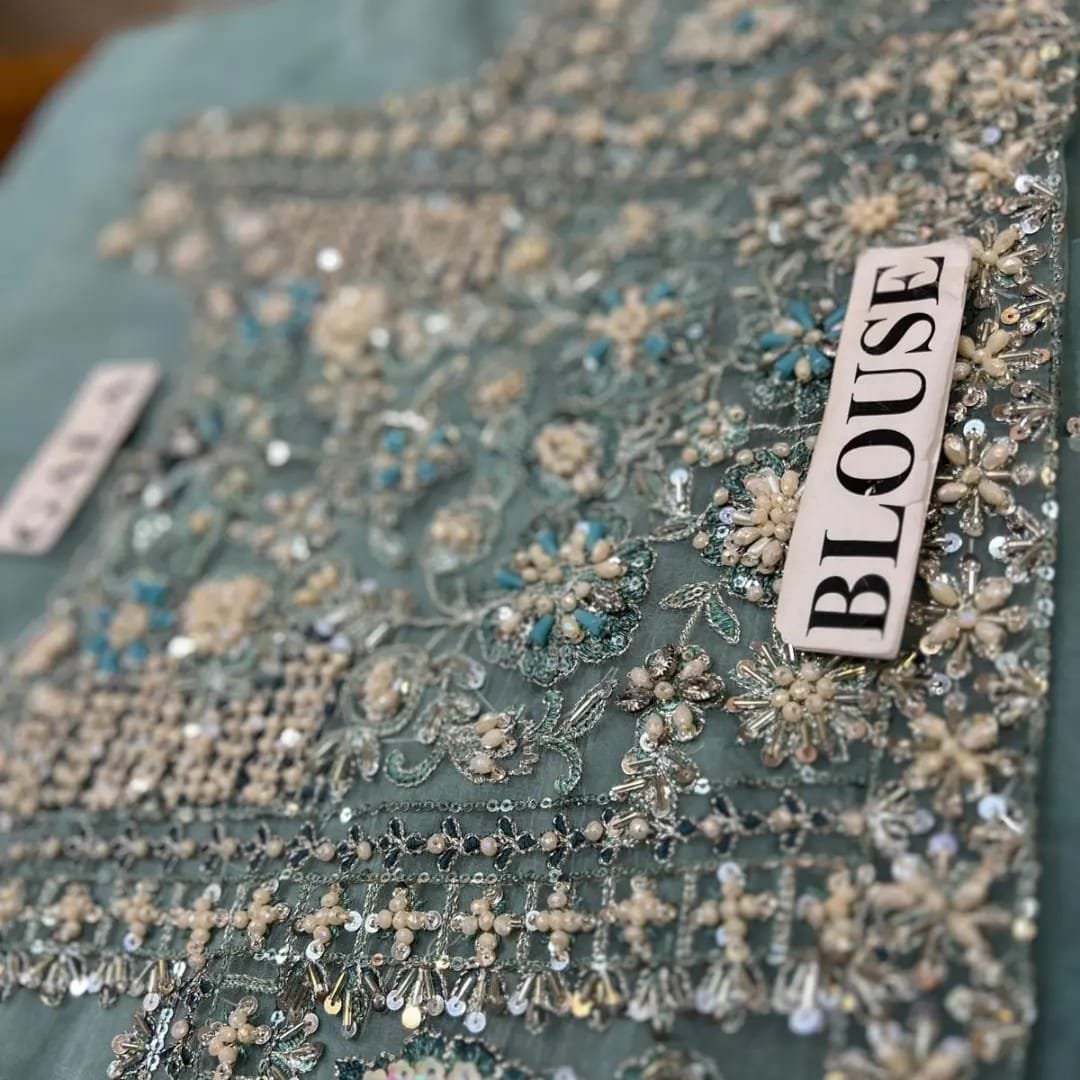 A dainty Ice-Blue silhouette, lavishly adorned with intricate embellishments on the front and back bodice, creates an alluring look. The opulent peshwas showcase heavy embellished borders, evoking a regal charm fit for royalty.
