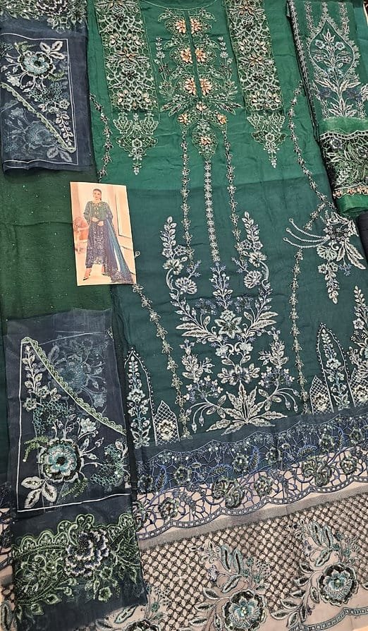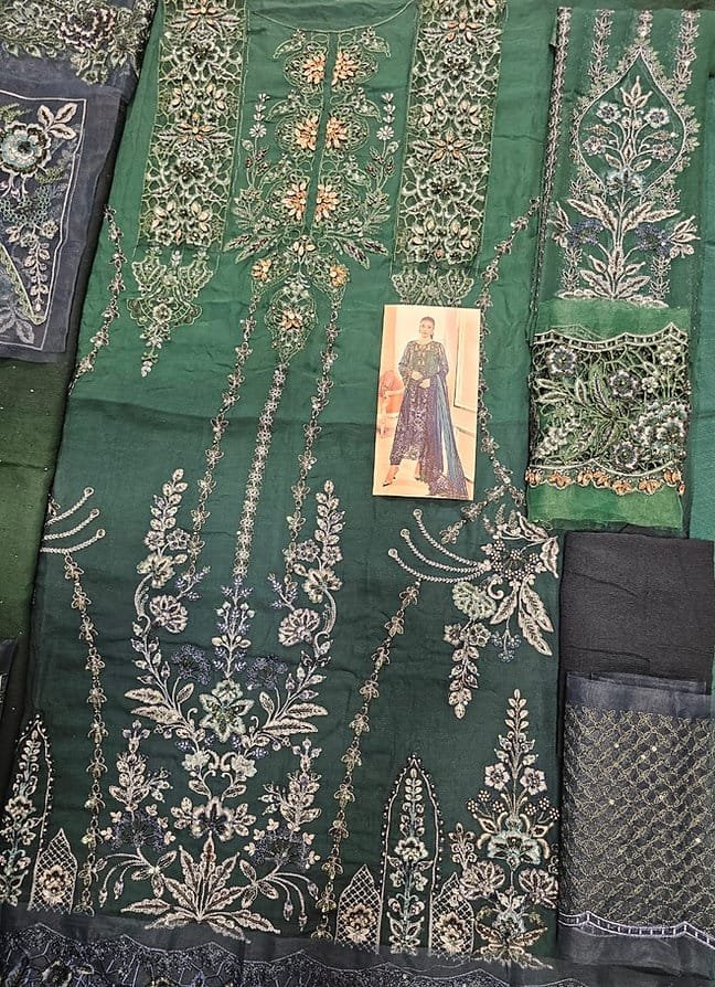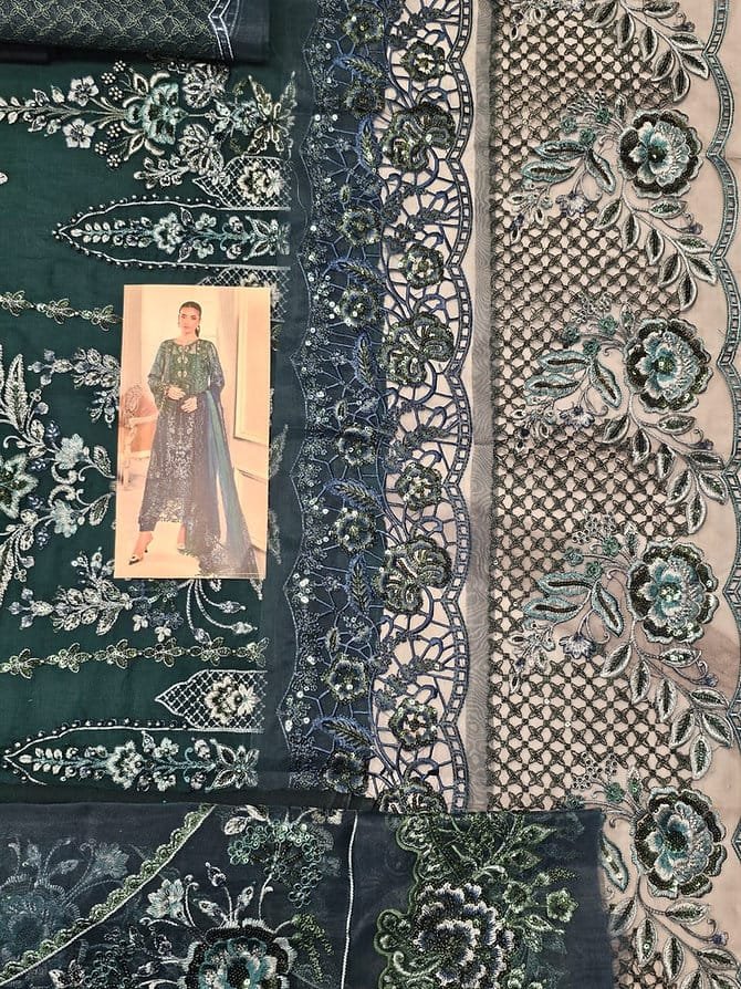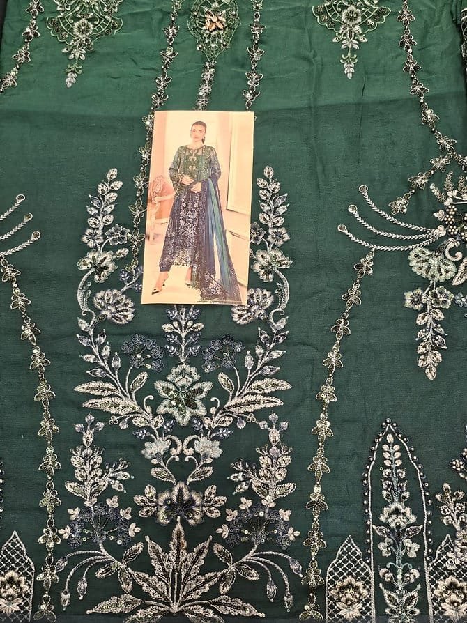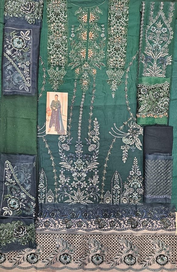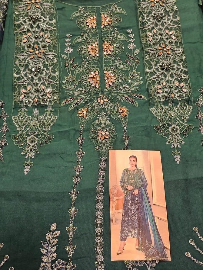The model images are provided solely for reference purposes. When you receive your dress, it will be based on the fabric shown in the open fabric or stitched dress pictures complete with the specified color, embroidery, and all embellishments.