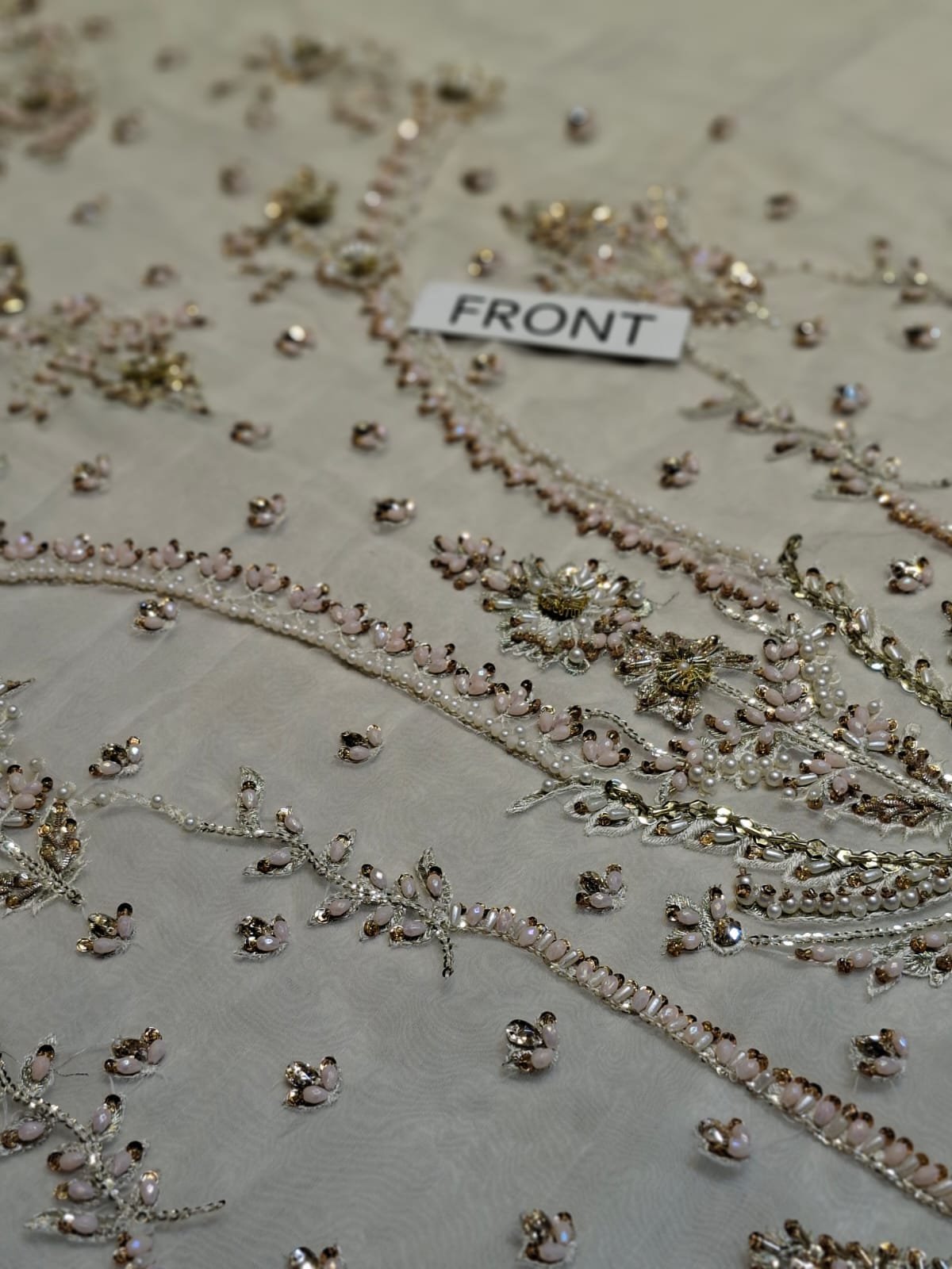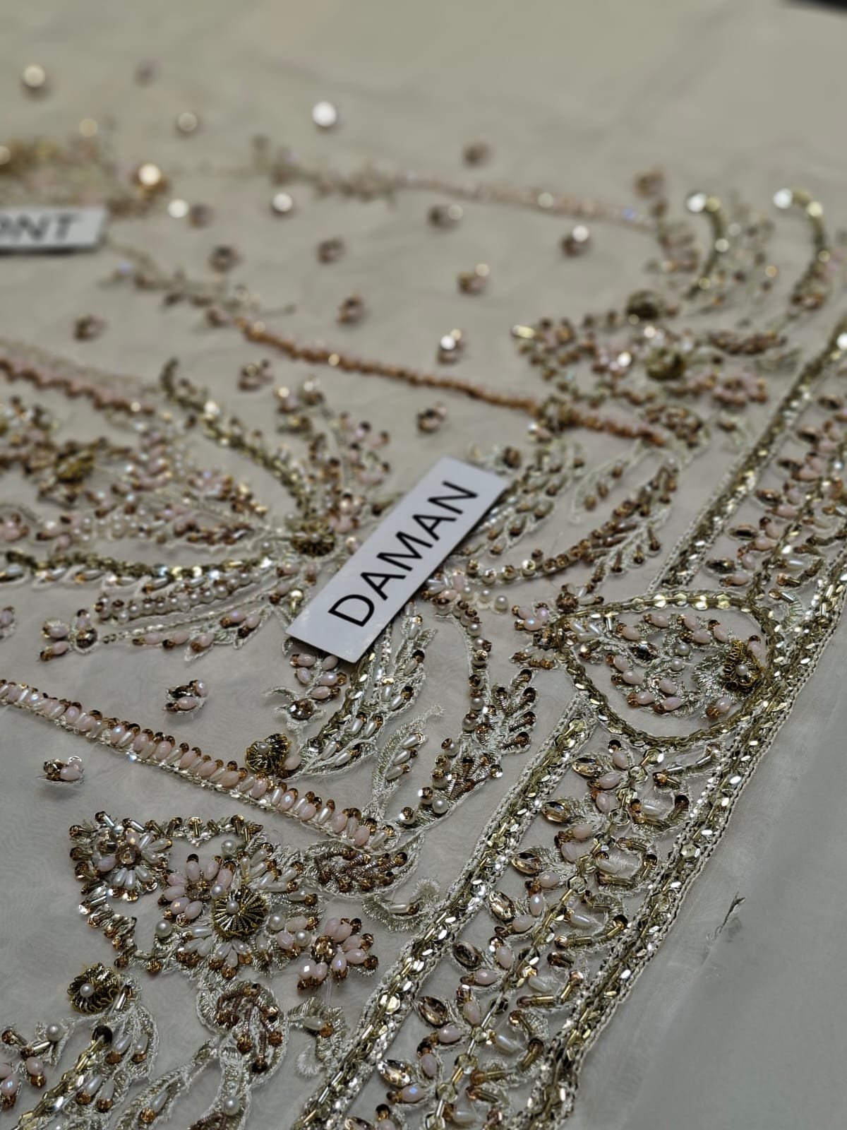 Zohra: Embodied Elegance in Ivory and Gold. An ethereal ensemble featuring an organza shirt and dupatta paired with raw silk farshi gharara. Exquisitely hand-embellished to radiate timeless beauty.